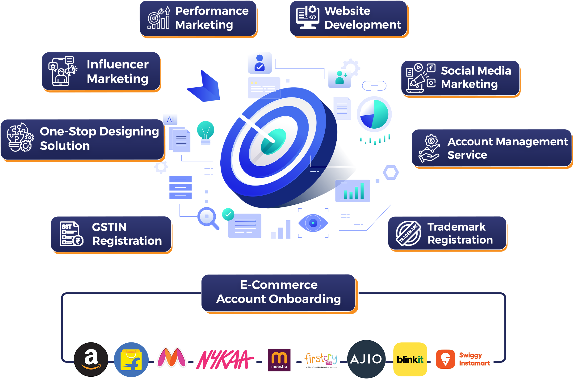 We offer a range of services including Digital Marketing, E-commerce Management (Amazon, Flipkart, etc.), Website Development, Social Media Marketing, and SEO — all tailored for Indian businesses.